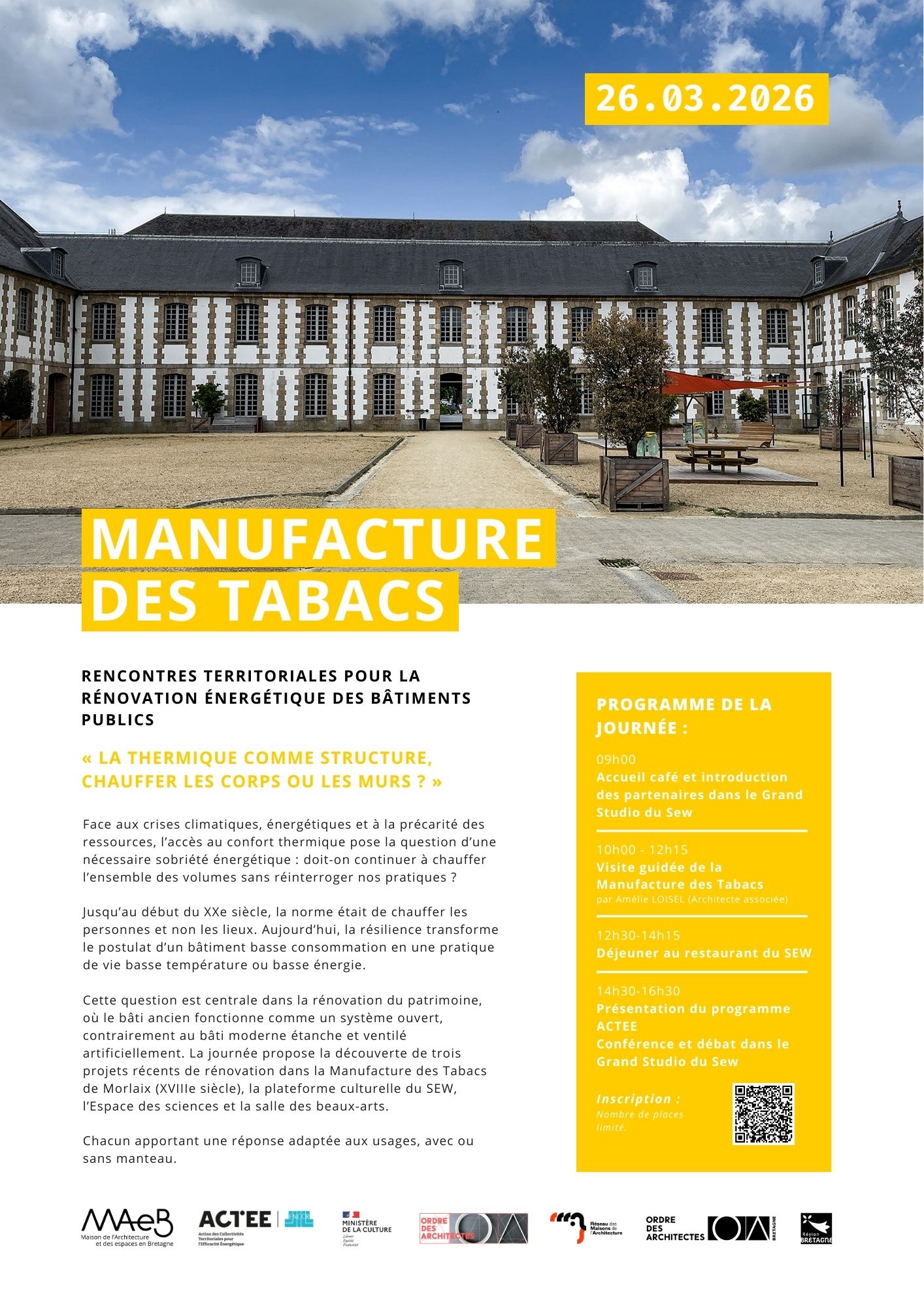 Le 26 mars 2026, la Maison de l’Architecture et des Espaces en Bretagne organise une journée dédiée à la rénovation énergétique des bâtiments publics dans le programme ACTEE (FNCCR), à la Manufacture des Tabacs (SEW), Morlaix. Une journée consacrée à la rénovation énergétique des bâtiments publics, autour de la thématique :